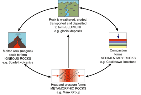 and transported to form new rocks. The cycle shows the three major groups